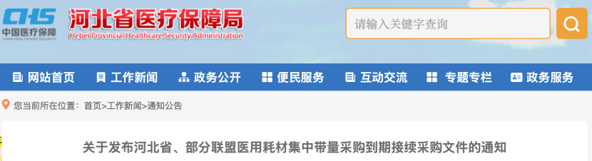 2月8日,河北省醫(yī)保局發(fā)布《關(guān)于發(fā)布河北省、部分聯(lián)盟醫(yī)用耗材集中帶量采購到期接續(xù)采購文件的通知》(附文末)。