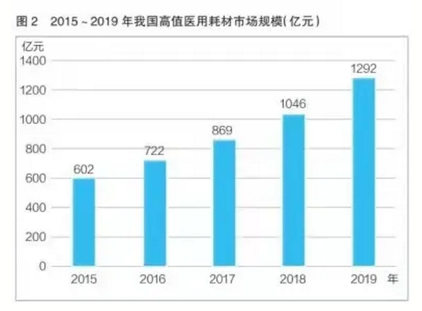 近年來,我國高值醫(yī)用耗材行業(yè)緊密結(jié)合產(chǎn)業(yè)上下游資源,充分掌握用戶需求變化,豐富應(yīng)用場景,帶來耗材需求的逐年增長。2015年,我國高值醫(yī)用耗材行業(yè)市場規(guī)模為602億元,2019年增長至1292億元(見圖2),2015~2019年的年復(fù)合增長率為21.04%。2020年,受新冠肺炎疫情影響,高值醫(yī)用耗材需求急劇增長,市場規(guī)模有望突破1600億元。預(yù)計2026年,我國高值醫(yī)用耗材市場規(guī)模將達(dá)3356億元,但受帶量采購、進(jìn)口替代等因素影響,市場增速將逐年趨緩。