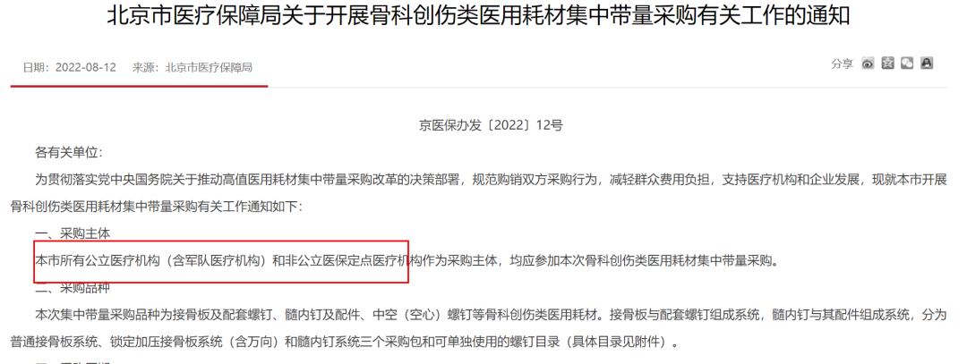 就在同一天(8月12日),北京市醫(yī)保局發(fā)布了《關(guān)于開(kāi)展骨科創(chuàng)傷類(lèi)醫(yī)用耗材集中帶量采購(gòu)有關(guān)工作的通知》,明確本次帶量采購(gòu)的主體,公立醫(yī)院、非公立醫(yī)保定點(diǎn)醫(yī)療機(jī)構(gòu)須全部參加。