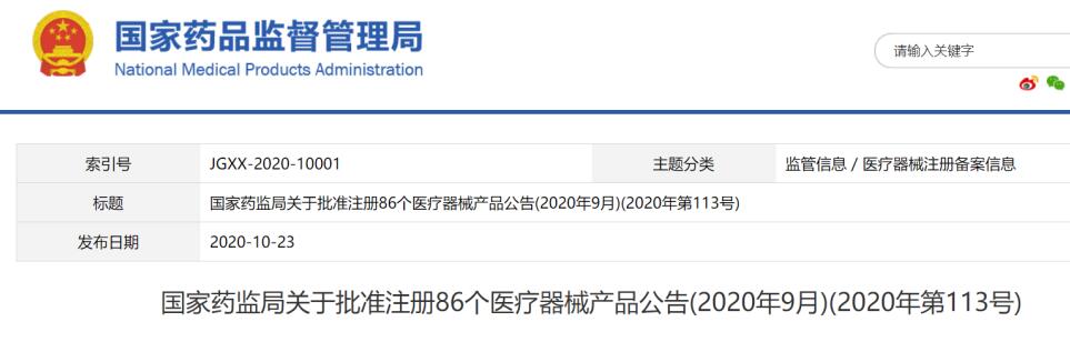 醫(yī)藥網(wǎng)10月27日訊 10月23日,國(guó)家藥監(jiān)局發(fā)布《國(guó)家藥監(jiān)局關(guān)于批準(zhǔn)注冊(cè)86個(gè)醫(yī)療器械產(chǎn)品公告(2020年9月)(2020年第113號(hào))》。