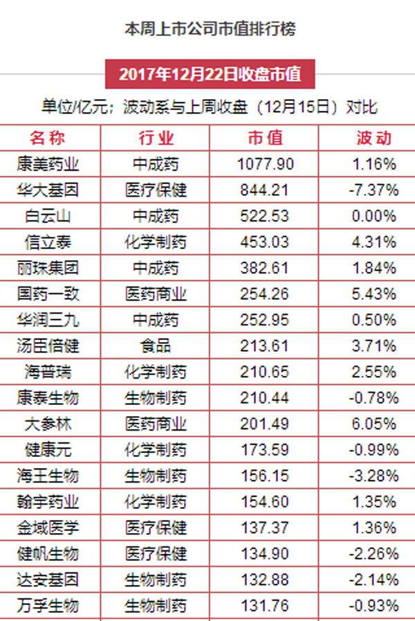 另外,從市值表現(xiàn)來看,本周有16家公司市值上漲,漲幅靠前的有大參林、宜華健康等公司;21家公司市值下跌,跌幅較大的有寶萊特、華大基因等公司。