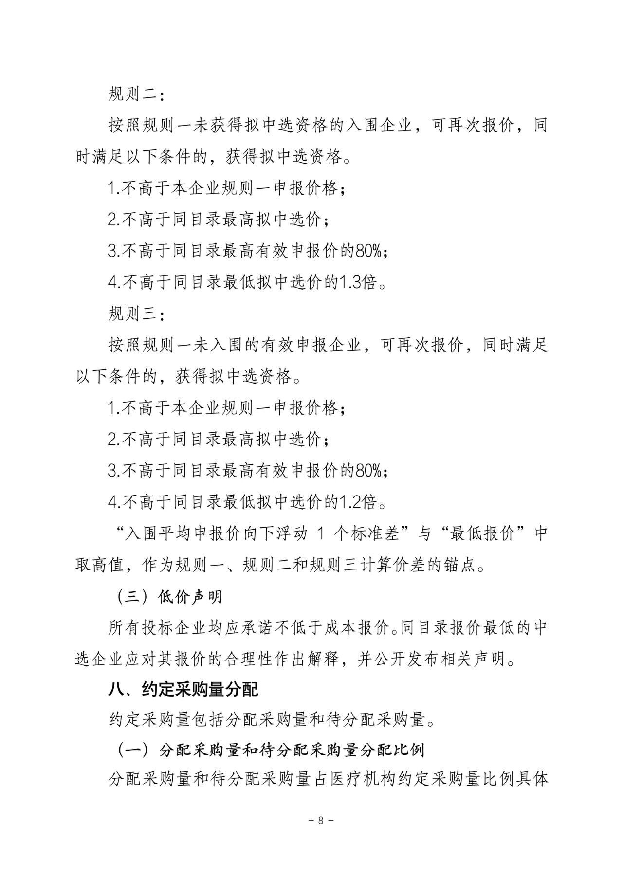 按照規(guī)則一未入圍的有效申報(bào)企業(yè),可再次報(bào)價(jià),同時(shí)滿足不高于本企業(yè)規(guī)則一申報(bào)價(jià)格、同目錄最高擬中選價(jià)、同目錄最高有效申報(bào)價(jià)的80%,同目錄最低擬中選價(jià)的1.2倍這四個(gè)條件的,獲得擬中選資格。