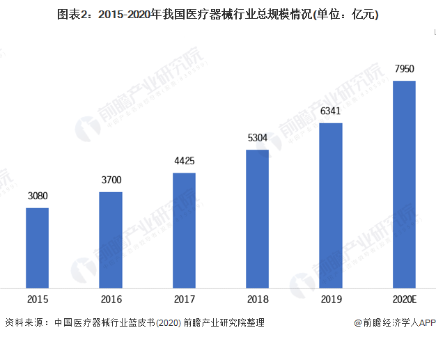 隨著我國(guó)醫(yī)療器械行業(yè)的技術(shù)革新及產(chǎn)業(yè)鏈成熟,市場(chǎng)容量將會(huì)不斷擴(kuò)大,加之疫情對(duì)我國(guó)醫(yī)療器械行業(yè)的巨大推動(dòng)作用。前瞻預(yù)計(jì),2020年我國(guó)醫(yī)療器械行業(yè)市場(chǎng)規(guī)模大約為7950億元。