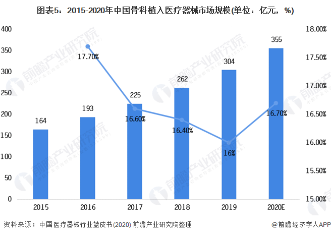 受集中采購(gòu)、國(guó)產(chǎn)“進(jìn)口替代”等因素影響,近幾年骨科植入市場(chǎng)規(guī)模增長(zhǎng)逐漸放緩。2019年我骨科植入耗材市場(chǎng)規(guī)模約為304億元,同比增長(zhǎng)16.03%。前瞻根據(jù)近年來中國(guó)骨科植入醫(yī)療器械市場(chǎng)的發(fā)展預(yù)測(cè)2020年中國(guó)骨科植入醫(yī)療器械市場(chǎng)規(guī)模約為355億元。