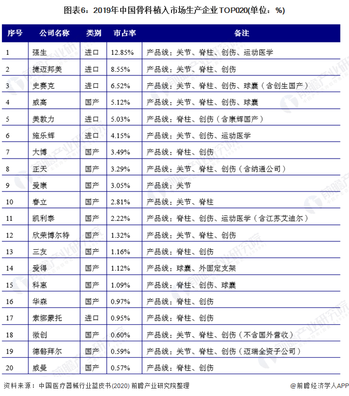 根據(jù)中國(guó)藥品監(jiān)督管理研究會(huì)在2020年12月發(fā)布的《醫(yī)療器械藍(lán)皮書:中國(guó)醫(yī)療器械行業(yè)發(fā)展報(bào)告(2020)》指出2019年中國(guó)骨科植入市場(chǎng)生產(chǎn)企業(yè)TOP020的前三均由海外企業(yè)占據(jù);分別是強(qiáng)生(12.85%)、捷邁邦美(8.55%)和史賽克(6.52%)。