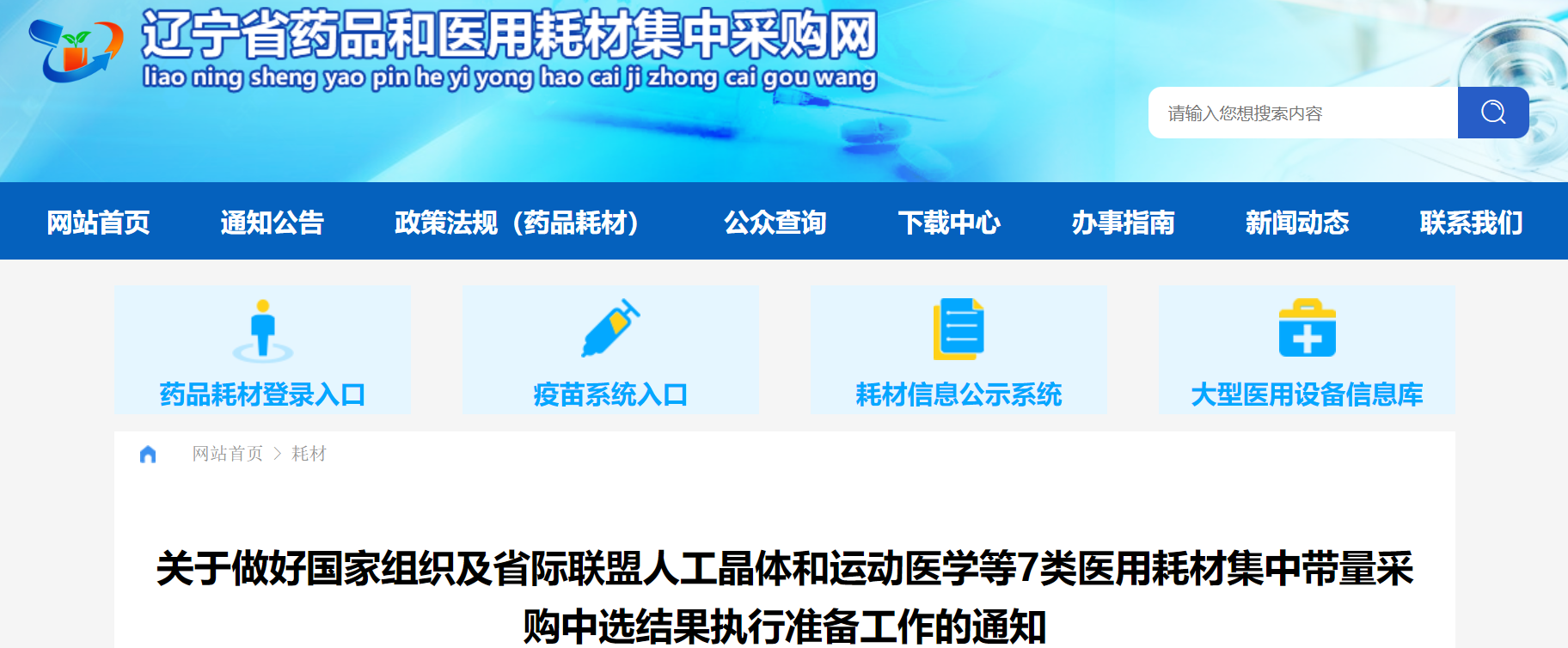 同日,遼寧省藥品及醫(yī)用耗材集中采購(gòu)網(wǎng)發(fā)布《關(guān)于做好國(guó)家組織及省際聯(lián)盟人工晶體和運(yùn)動(dòng)醫(yī)學(xué)等7類醫(yī)用耗材集中帶量采購(gòu)中選結(jié)果執(zhí)行準(zhǔn)備工作的通知》。