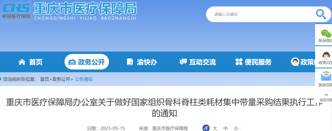 今日(5月15日),重慶市醫(yī)保局官網(wǎng)發(fā)布《重慶市醫(yī)療保障局辦公室關(guān)于做好國家組織骨科脊柱類耗材集中帶量采購結(jié)果執(zhí)行工作的通知》,明確自5月31日起,執(zhí)行國家組織骨科脊柱類耗材集采結(jié)果。