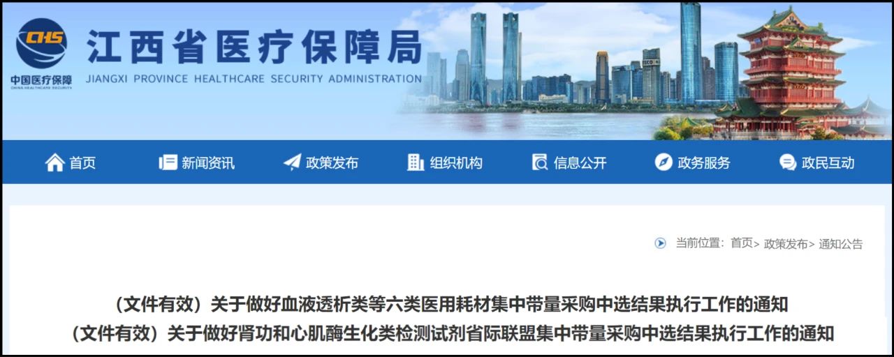 5月31日,江西醫(yī)保局發(fā)布《關于做好血液透析類等六類醫(yī)用耗材集中帶量采購中選結果執(zhí)行工作的通知》《關于做好腎功和心肌酶生化類檢測試劑省際聯(lián)盟集中帶量采購中選結果執(zhí)行工作的通知》。