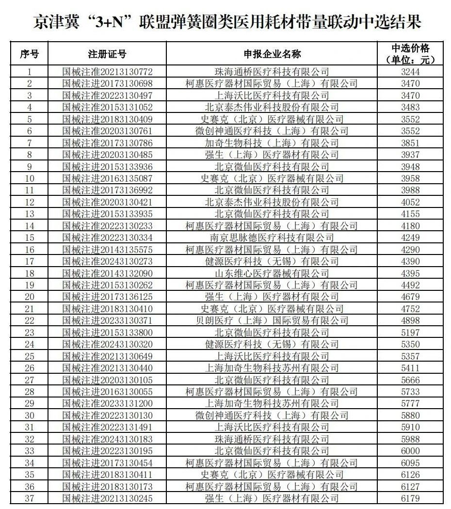 3月29日,京津冀醫(yī)藥聯(lián)合采購平臺發(fā)布《關(guān)于公布京津冀“3+N”聯(lián)盟彈簧圈類醫(yī)用耗材帶量聯(lián)動中選結(jié)果的通知》。