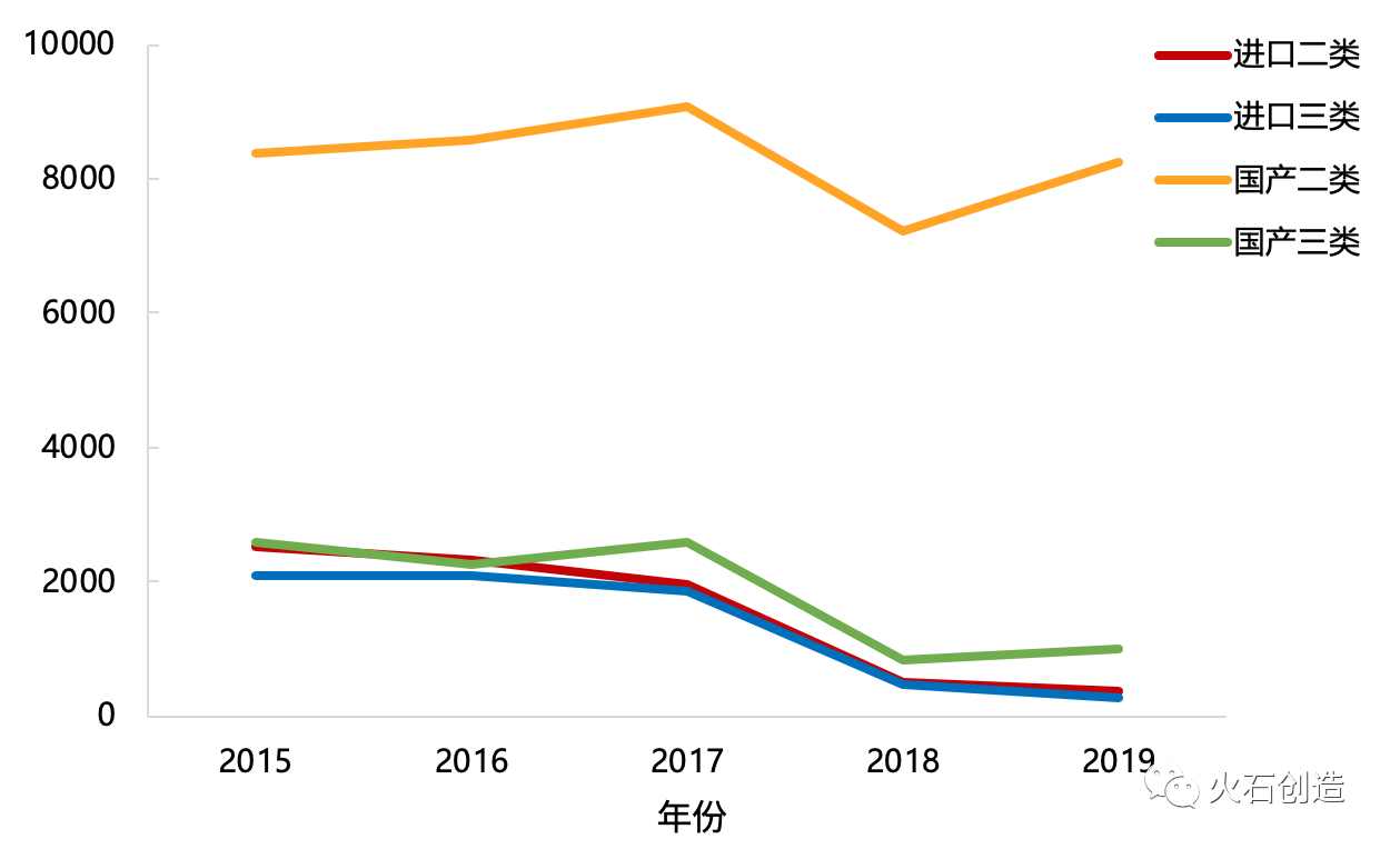 表1 2015—2019年二類器械國產(chǎn)與進口獲批總數(shù)對比