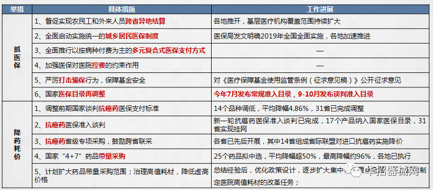 醫(yī)療保障局上線后,備受關(guān)注。梳理其上線后的工作,雖一手抓醫(yī)保、一手降藥(耗)價(jià),開(kāi)展了多項(xiàng)令人矚目的工作(具體工作及進(jìn)展見(jiàn)下圖)。但或許是精力有限,又或許是醫(yī)用耗材在整個(gè)醫(yī)藥領(lǐng)域占比小等原因,尚未真正影響醫(yī)用耗材領(lǐng)域。