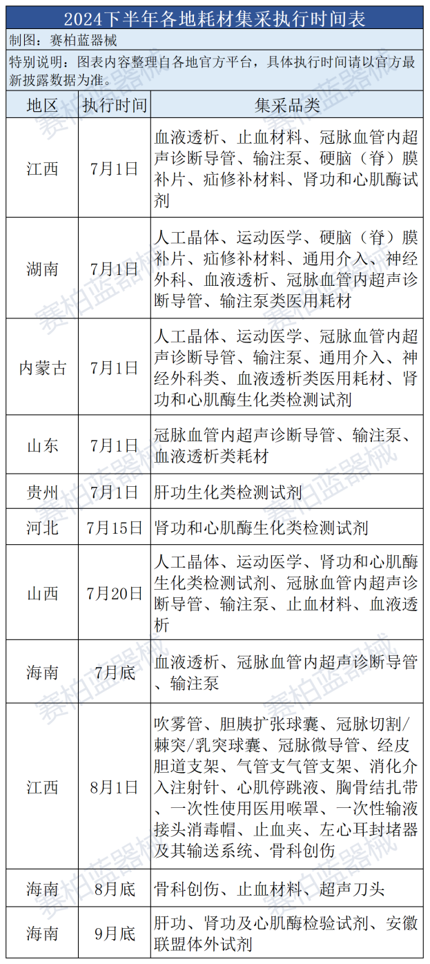 7月以來,耗材集采執(zhí)行節(jié)奏加快,江西、湖南、內蒙古、山東、貴州等多地推進耗材集采落地,河北、山西、海南等地也明確了部分耗材集采執(zhí)行時間。整體來看,多個大型聯盟集采的執(zhí)行進程進入中段,預計2024下半年將基本落地。
