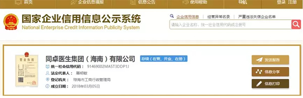 2018年3月5日,同卓醫(yī)生集團(海南)有限公司經(jīng)海南省工商局核準正式成立。