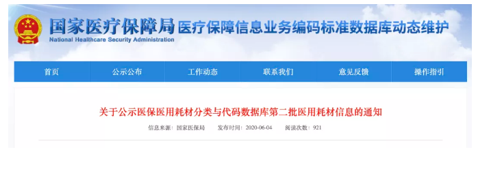 (6月4日),國家醫(yī)保局發(fā)布“關(guān)于公示醫(yī)保醫(yī)用耗材分類與代碼數(shù)據(jù)庫第二批醫(yī)用耗材信息的通知”,內(nèi)容根據(jù)《國家醫(yī)療保障局關(guān)于印發(fā)醫(yī)療保障標(biāo)準(zhǔn)化工作指導(dǎo)意見的通知》有關(guān)要求,現(xiàn)將第二批醫(yī)用耗材信息予以公示。