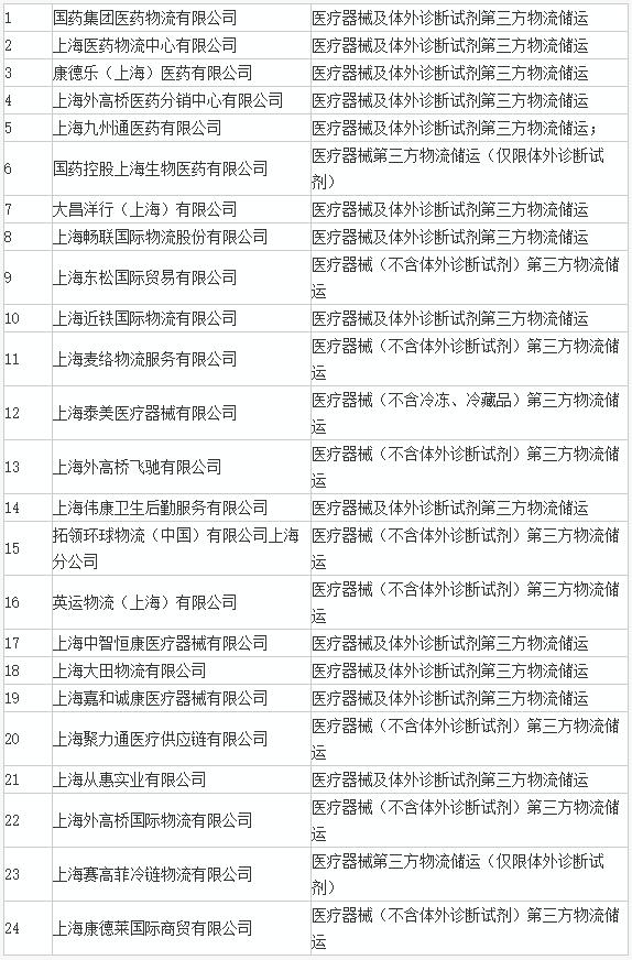 去年6月27日,上海食藥監(jiān)局公布了“為其他藥品經(jīng)營企業(yè)、醫(yī)療器械生產(chǎn)經(jīng)營企業(yè)提供貯存、配送服務(wù)企業(yè)名單(2016年6月27日)”共有24家醫(yī)療器械經(jīng)營企業(yè)獲得第三方配送醫(yī)療器械的資格。