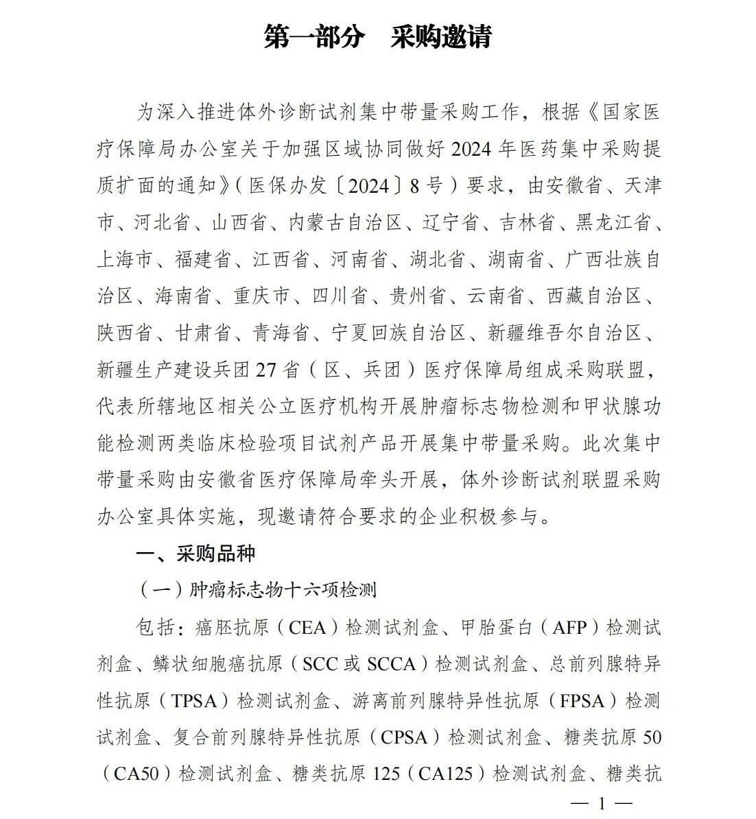 10月31日,安徽醫(yī)保局發(fā)布《二十七省(區(qū)、兵團)2024年體外診斷試劑省際聯(lián)盟集中帶量采購文件(征求意見稿)》(完整見文末)。