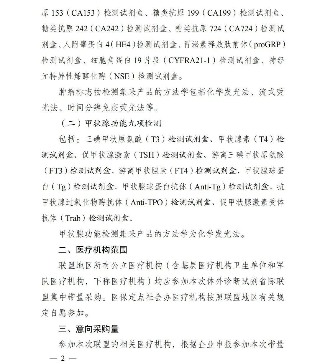 此次集采周期兩年,采購品種包括腫瘤標志物檢測產(chǎn)品十六項(化學發(fā)光法、流式熒光法、時間分辨免疫熒光法等)與甲狀腺功能檢測產(chǎn)品九項(化學發(fā)光法),具體如下: