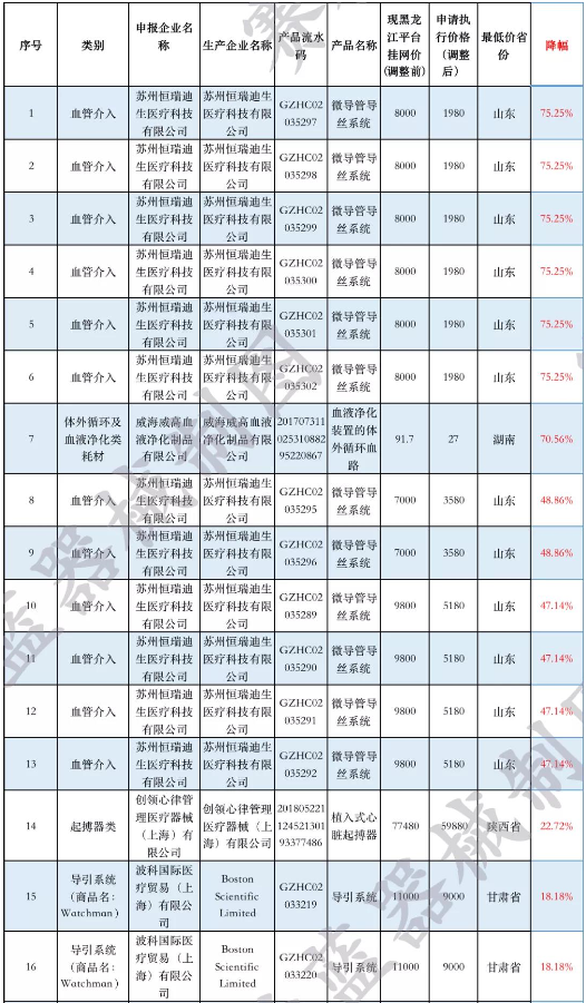 體外循環(huán)及血液凈化類最低降幅4.96%,最高降幅70.56%(聯(lián)動省份為湖南省),平均降幅37.76%;血管介入類最高降幅75.25%(聯(lián)動省份為山東省),平均降幅8.35%;