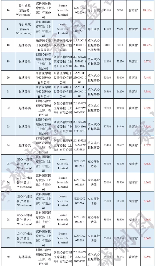 在降幅方面,導引系統(tǒng)平均降幅18.18%;左心耳封堵器平均降幅6.36%;起搏器類最低降幅2.04%,最高降幅22.72%(聯(lián)動省份為陜西省),平均降幅8.39%;