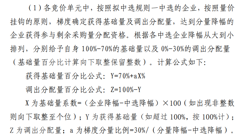 (1)擬中選規(guī)則一:同一競價單元內(nèi),企業(yè)降幅達相應(yīng)中選降幅要求的企業(yè)獲得擬中選資格。