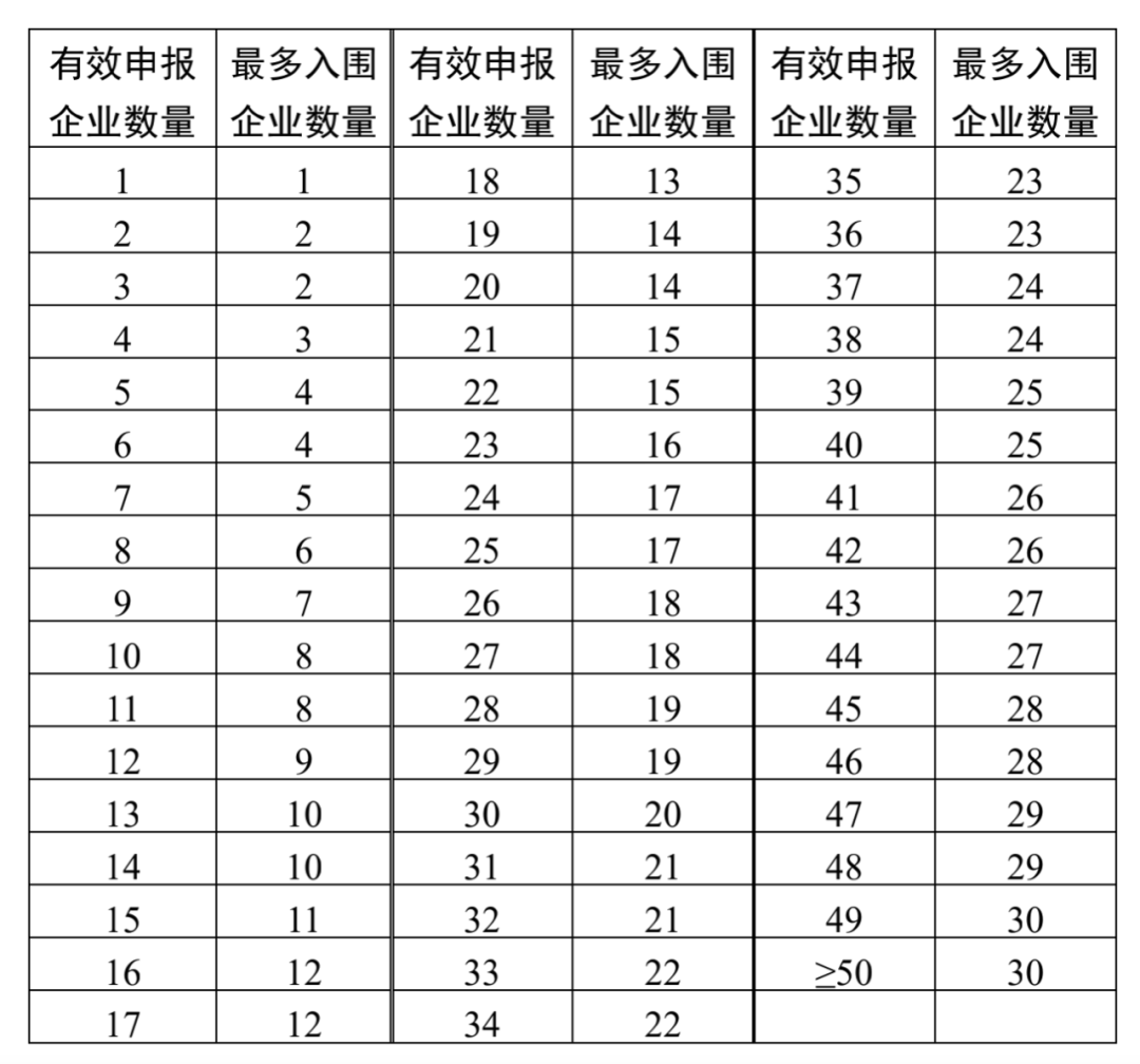 規(guī)則一:A、B 競價單元內(nèi),分別按有效申報企業(yè)競價比價價格由低到高排序,確定入圍企業(yè)。入圍企業(yè)的競價產(chǎn)品系統(tǒng)競價比價價格不高于相應最高有效申報價。最多入圍企業(yè)數(shù)量如下: