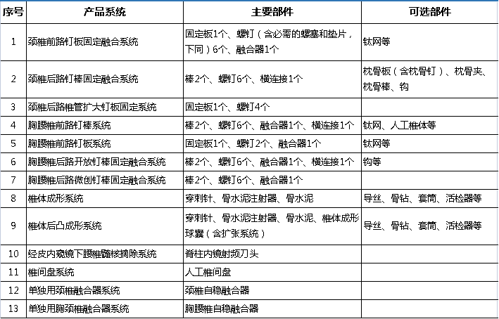 文件提出,以臨床需求為出發(fā)點(diǎn),根據(jù)手術(shù)類型、手術(shù)部位、入路方式等組件產(chǎn)品系統(tǒng)進(jìn)行采購。產(chǎn)品系統(tǒng)共分為13個,分別如下: