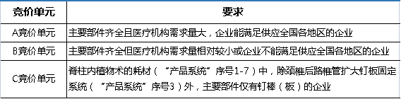按照確保臨床使用和供應(yīng)穩(wěn)定、兼顧各類型產(chǎn)品和企業(yè)的原則,同一產(chǎn)品系統(tǒng)類別下,綜合考慮醫(yī)療機(jī)構(gòu)需求、企業(yè)供應(yīng)意愿和供應(yīng)能力、產(chǎn)品組合完整度等因素,將企業(yè)分單元分別競價,分為A、B、C三個競價單元。與國采關(guān)節(jié)相比,多了一個競價單元。