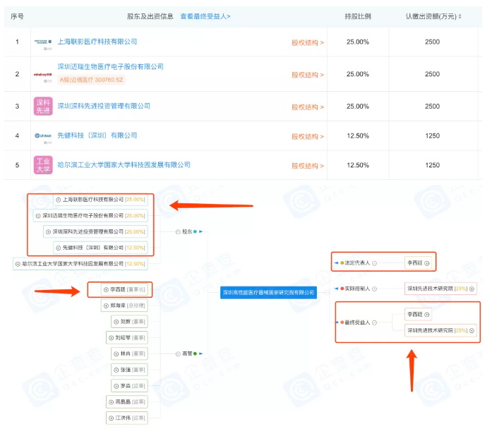 據(jù)企查查顯示,新公司的股東和出資信息顯示,聯(lián)影、邁瑞各持股比例25%,先健科技持股12.5%,李西廷任董事長(zhǎng)。