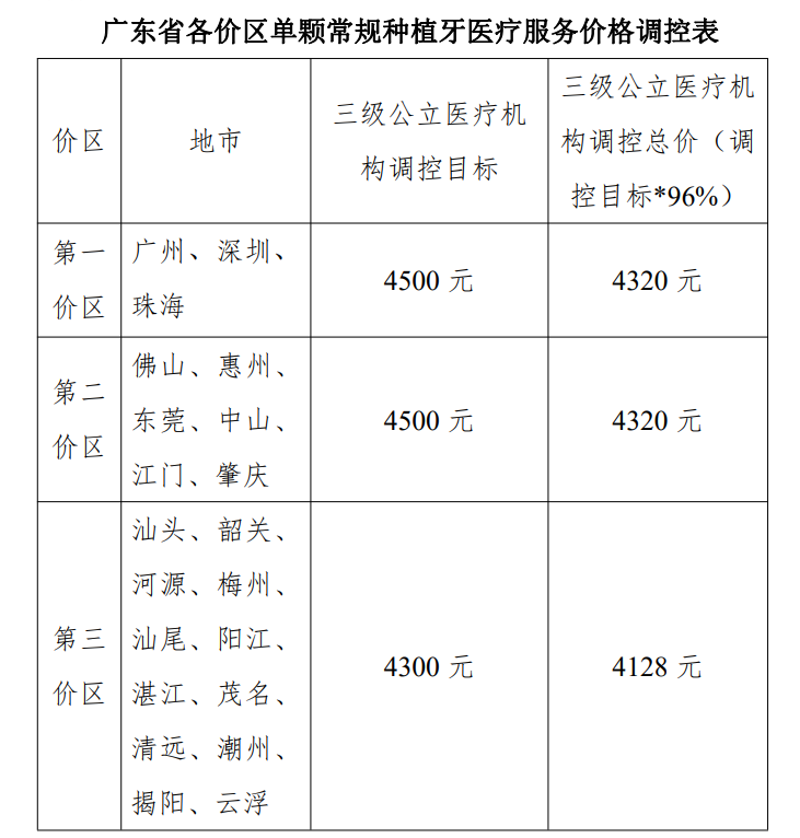 例如,廣東省制定口腔種植類(lèi)醫(yī)療服務(wù)價(jià)格項(xiàng)目基準(zhǔn)價(jià),將全省21個(gè)地市分為3個(gè)價(jià)區(qū),基準(zhǔn)價(jià)為第二價(jià)區(qū)最高指導(dǎo)價(jià)(允許放寬情形除外),第一價(jià)區(qū)可在規(guī)定的基準(zhǔn)價(jià)基礎(chǔ)上適當(dāng)上浮5%-20%,第二價(jià)區(qū)可下浮,第三價(jià)區(qū)至少下浮5%。