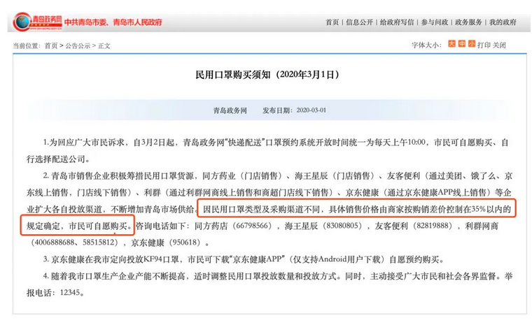 不止南通市,青島市政務網發(fā)布了“民用口罩購買須知”,消息指出,因民用口罩類型及采購渠道不同,具體銷售價格由商家按購銷差價控制在35%以內的規(guī)定確定,市民可自愿購買。