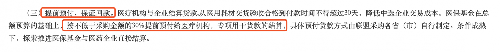 在回款上,醫(yī)療機構(gòu)與企業(yè)結(jié)算貨款,從醫(yī)用耗材交貨驗收合格到付款時間不得超過30天,降低中選企業(yè)交易成本。醫(yī)保基金在總額預算的基礎(chǔ)上,按不低于采購金額的30%提前預付給醫(yī)療機構(gòu),專項用于貨款的結(jié)算,具體預付貨款方式由聯(lián)盟采購各省(市)自行制定。