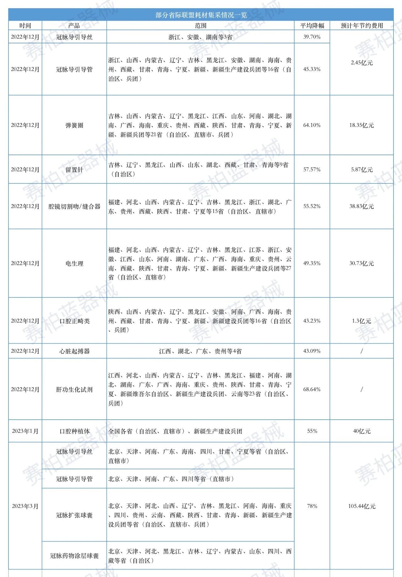 據(jù)賽柏藍(lán)器械梳理,近半年來(lái)開(kāi)展的主要省際聯(lián)盟集采涉及冠脈導(dǎo)引導(dǎo)絲、冠脈導(dǎo)引導(dǎo)管、冠脈擴(kuò)張球囊、口腔正畸類、電生理、腔鏡切割吻/縫合器、留置針、彈簧圈等諸多耗材,各聯(lián)盟年總節(jié)約費(fèi)用預(yù)計(jì)超200億元。
