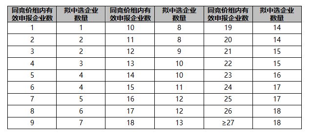擬中選產(chǎn)品確定方面,按照綜合評(píng)審得分從高到低依次排序,確定擬中選企業(yè)。最多擬中選企業(yè)數(shù)量詳見下表: