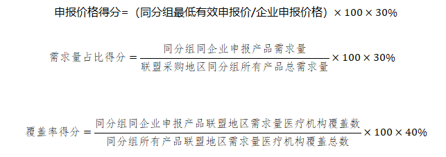 根據(jù)帶量采購(gòu)文件,對(duì)每個(gè)競(jìng)價(jià)單元的申報(bào)價(jià)、需求量占比、醫(yī)療機(jī)構(gòu)覆蓋率進(jìn)行綜合打分評(píng)審,分值比重分別為30%、30%、40%,三項(xiàng)分值相加為綜合評(píng)審得分。