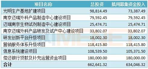據(jù)招股說明書顯示,邁瑞醫(yī)療上述項目總投資額66.26億元,預(yù)計使用募集資金凈額63.40億元。本次募集資金投資項目將在現(xiàn)有主營業(yè)務(wù)的基礎(chǔ)上進行擴產(chǎn),進一步突破現(xiàn)有產(chǎn)能瓶頸、改進生產(chǎn)工藝、豐富產(chǎn)品和提升產(chǎn)品質(zhì)量,進一步提升公司的業(yè)務(wù)規(guī)模和市場地位;而擴建外科產(chǎn)品研發(fā)及試產(chǎn)中心、升級研發(fā)創(chuàng)新平臺,可提升技術(shù)開發(fā)實例,為公司的新產(chǎn)品研發(fā)提供更好的創(chuàng)新平臺;升級營銷服務(wù)體系、進行信息化系統(tǒng)建設(shè)等,有利于深挖市場、拓寬銷售渠道,推動公司持續(xù)健康的發(fā)展。