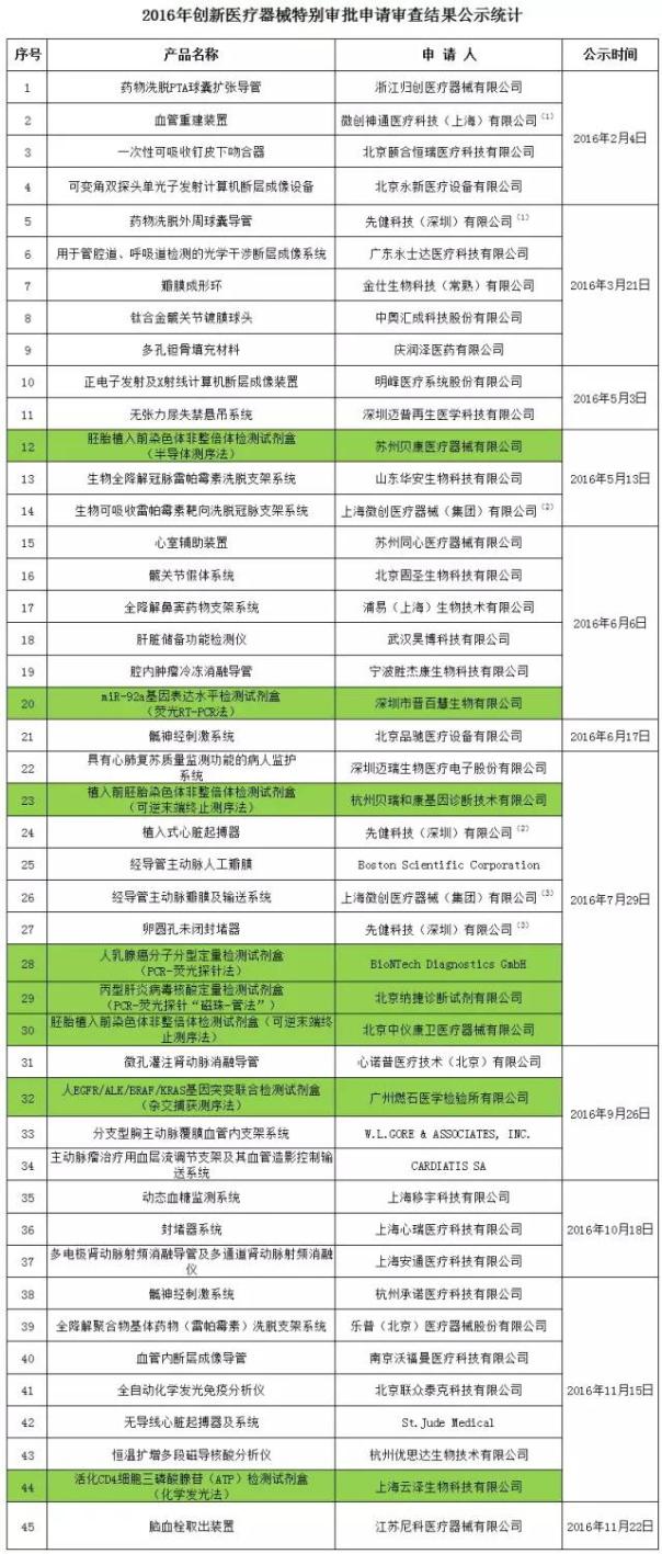 本文盤點了今年截止到2016年12月7日,通過2016年創(chuàng)新醫(yī)療器械特別審批申請審查的45款產品;其中有2家公司(標有上標)各有3項產品入圍,關于體外診斷的項目(背景為綠色)共有8項。