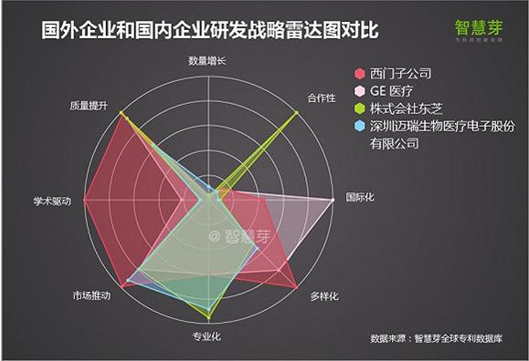 本次分析中我們以深圳邁瑞公司為例,對比國內(nèi)企業(yè)與國外“三巨頭”德國西門子,美國通用和日本東芝公司在高端影像醫(yī)學設(shè)備領(lǐng)域的專利的多項指標進行對比,從而挖掘出國內(nèi)企業(yè)和國外巨頭相比,在研發(fā)策略上的異同。