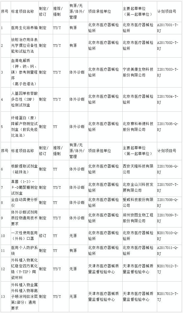 總局印發(fā)2017年醫(yī)療器械行業(yè)標(biāo)準(zhǔn)制修訂項目