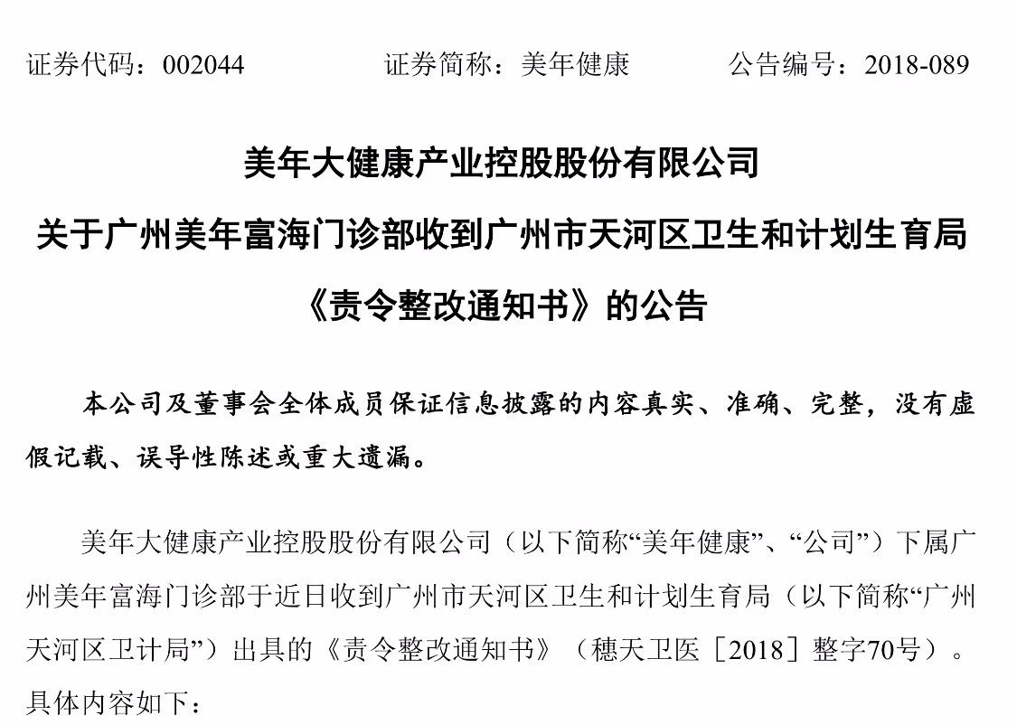 美年健康在8月5日晚的公告中表示,在收到《責令整改通知書》后,第一時間派駐專項工作小組進駐廣州美年富海門診部,進行深度調(diào)查,并逐步落實整改。