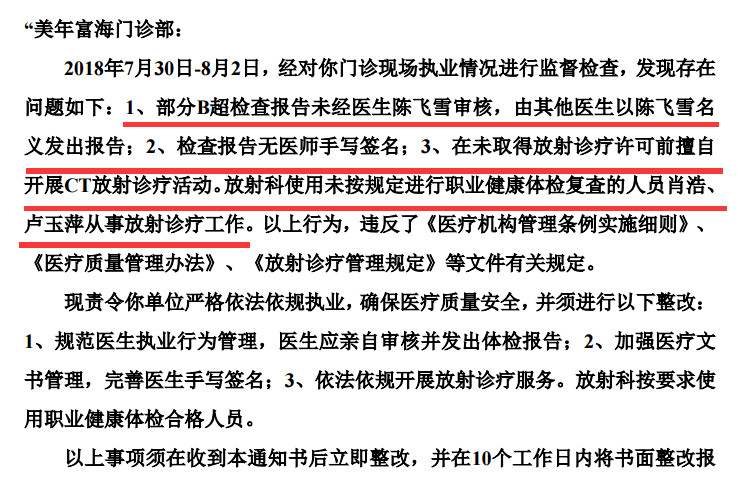 8月5日晚,美年健康發(fā)布公告,廣州美年富海門診部收到廣州市天河區(qū)衛(wèi)生和計劃生育局《責令整改通知書》,證實了美年健康美年富海門診部存在冒名醫(yī)生、體檢報告無醫(yī)師手寫簽名、違規(guī)開展CT放射診療活動等三大違規(guī)行為: