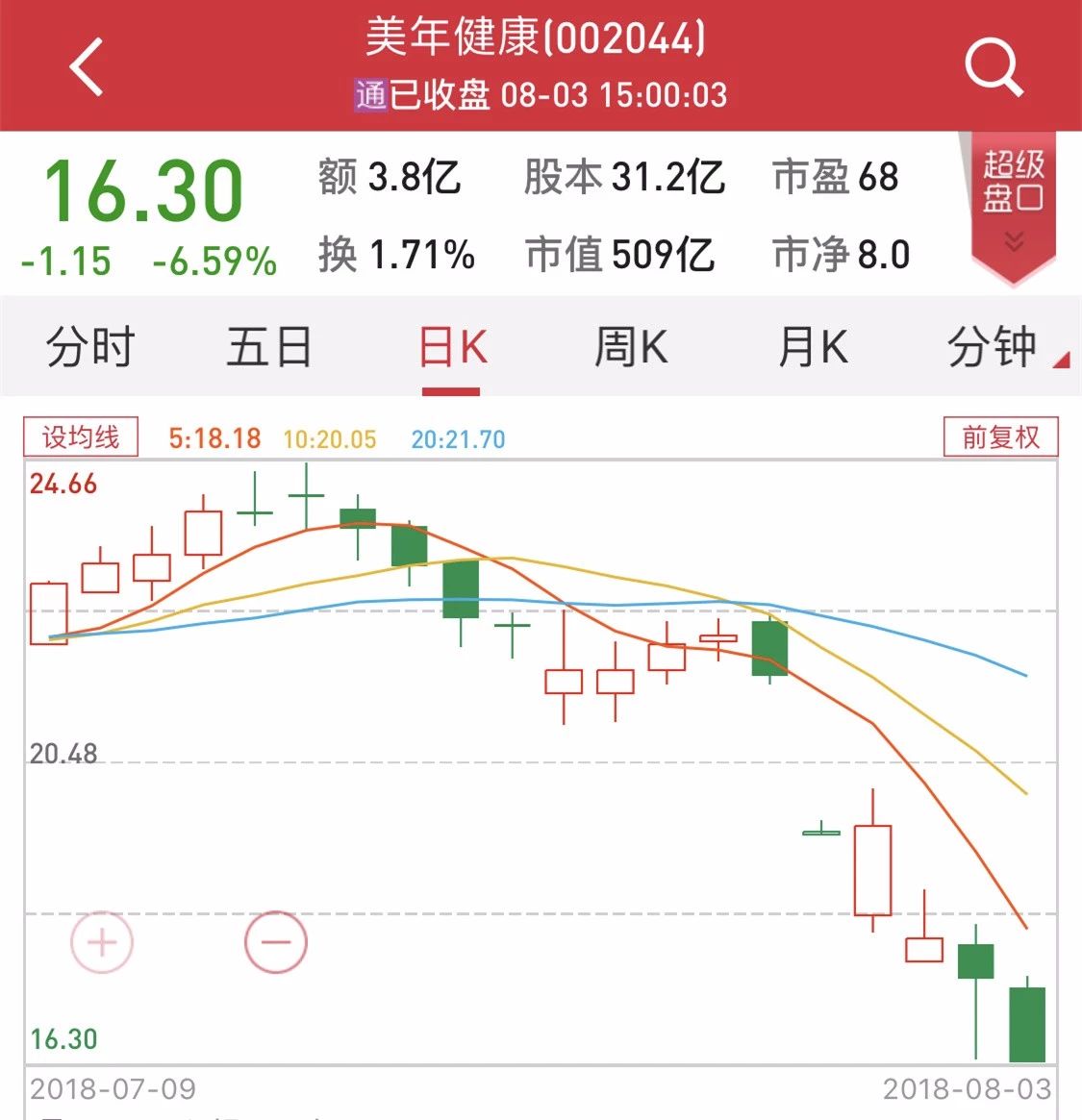 總的來看,自7月30日以來,美年健康股價已大幅下跌24.88%,跌幅超過同期醫(yī)療器械板塊和大盤。此外,在這一時間段,美年健康已累計成交28.9億元,累計換手率達到12.09%,市值從677.38億元降至508.82億元,短短一周時間縮水近170億元。