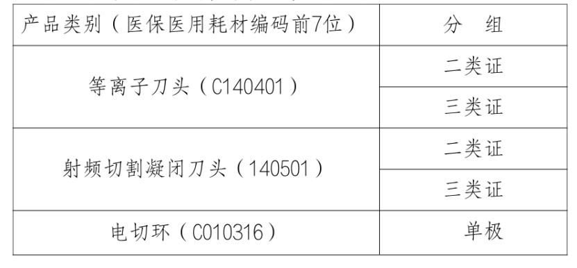 以國(guó)家醫(yī)保局醫(yī)保醫(yī)用耗材編碼前7位C140401、C140501、C010316確定產(chǎn)品類別,并按注冊(cè)管理類別或功能屬性進(jìn)行分組(具體見(jiàn)下表)。若任一組內(nèi)企業(yè)數(shù)小于等于3家時(shí),該產(chǎn)品類別不分組。