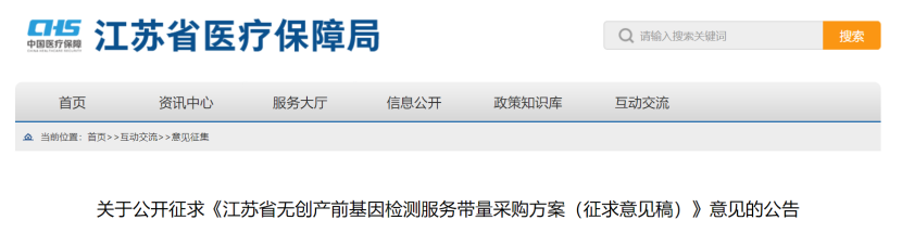7月3日,江蘇醫(yī)保局發(fā)布《關(guān)于公開征求<江蘇省無(wú)創(chuàng)產(chǎn)前基因檢測(cè)服務(wù)帶量采購(gòu)方案(征求意見稿)>意見的公告》。