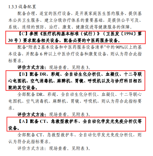 在設(shè)備配置方面,除了基礎(chǔ)設(shè)備,還要求提高檢驗(yàn)檢查服務(wù)能力,合理配置和更新必要的設(shè)施設(shè)備,開展常規(guī)檢驗(yàn)和心電、超聲、X線影像等檢查服務(wù)。