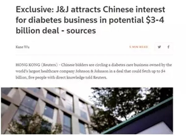 1月17日,路透社獨家重磅:中國買家正競購全球最大醫(yī)療保健公司強生(J & J)的糖尿病護理業(yè)務,交易價格或達40億美元(約合人民幣257億元)。買家包括中國的上市公司三諾生物和中國建投組成的一個聯(lián)合財團。