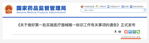 今日下午(10月15日),國家藥監(jiān)局官網(wǎng)發(fā)布通知,《關(guān)于做好第一批實施醫(yī)療器械唯一標識工作有關(guān)事項的通告》正式發(fā)布。