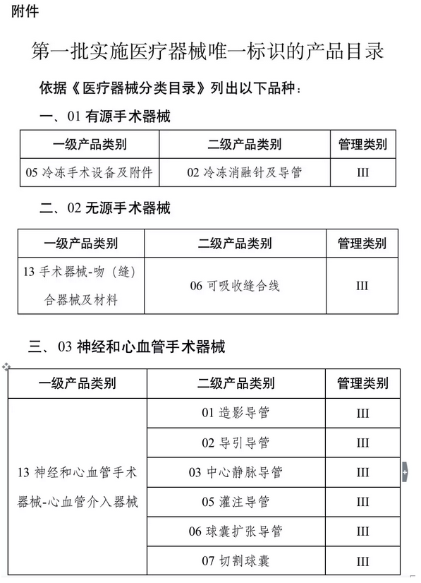 心臟起搏器、髖關(guān)節(jié)假體、整形用注射填充物等九大類64個品種被列入第一批實施醫(yī)療器械唯一標識的產(chǎn)品目錄,(具體產(chǎn)品目錄文末見附件)。