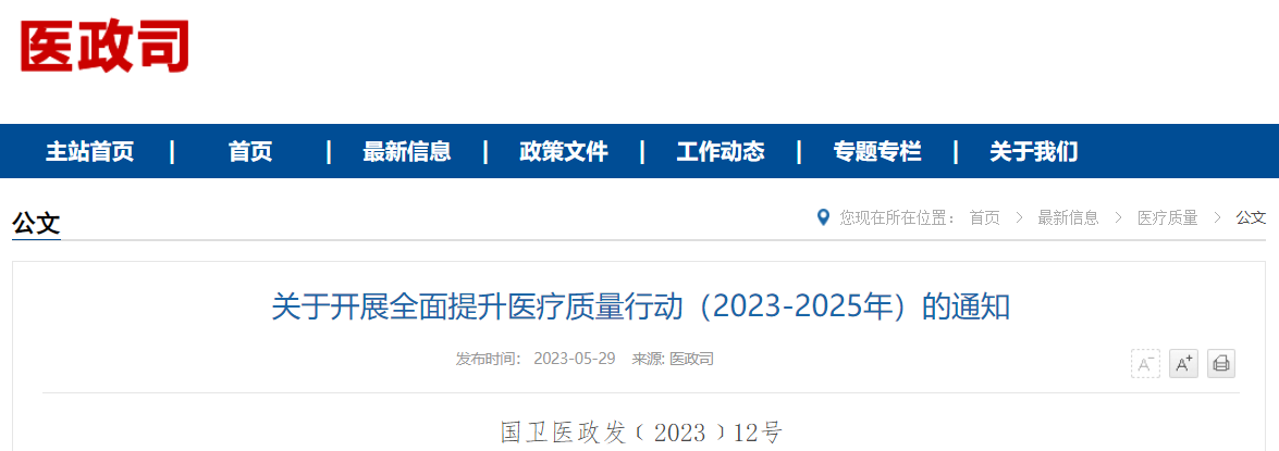 5月29日,國家衛(wèi)健委發(fā)布《關(guān)于開展全面提升醫(yī)療質(zhì)量行動(dòng)(2023-2025年)的通知》(簡稱《通知》),從基礎(chǔ)質(zhì)量安全管理、關(guān)鍵環(huán)節(jié)和行為管理、質(zhì)量安全管理體系建設(shè)等維度提出了28項(xiàng)具體措施和5個(gè)專項(xiàng)行動(dòng)。
