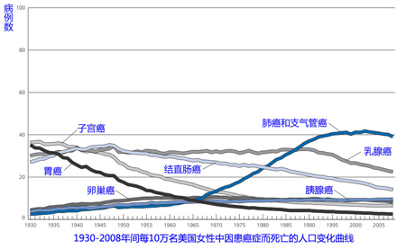 圖3:1930-2008年間每10萬(wàn)名美國(guó)女性因患癌而死亡的人口變化曲線
