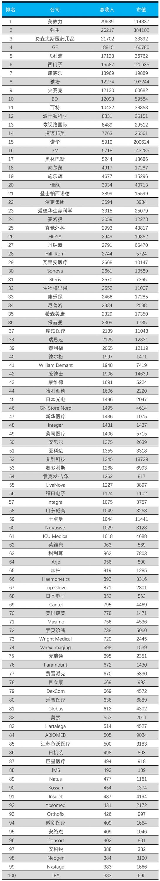 2018全球醫(yī)療器械公司100強(qiáng),6家中國公司!